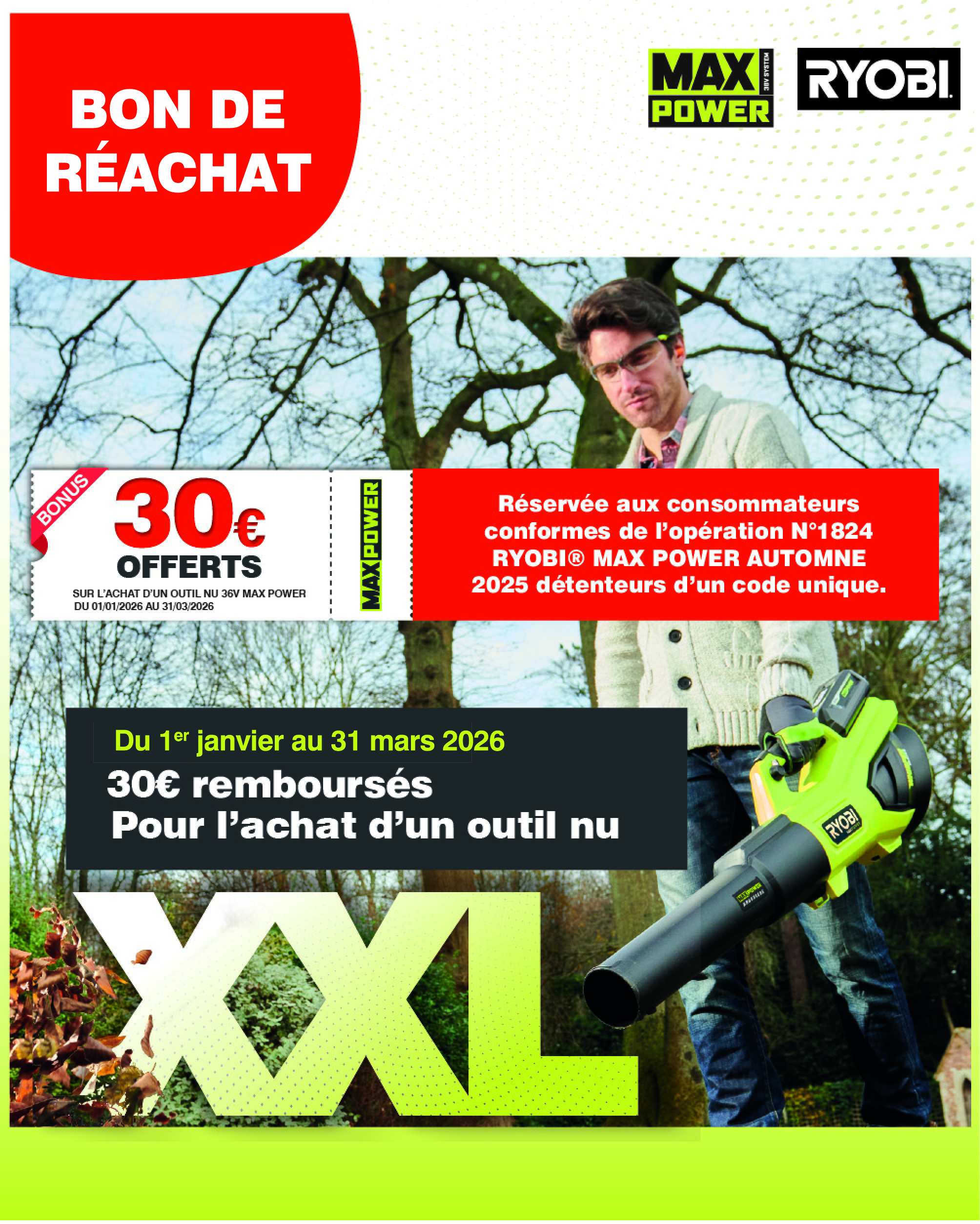 OFFRE BON DE RÉACHAT RYOBI® 36V MAX POWER – 30€ REMBOURSÉS